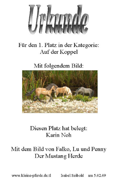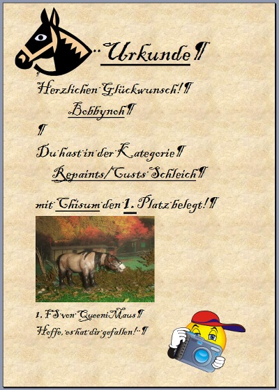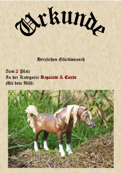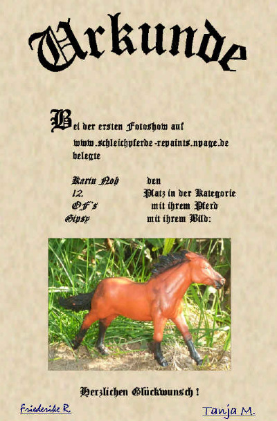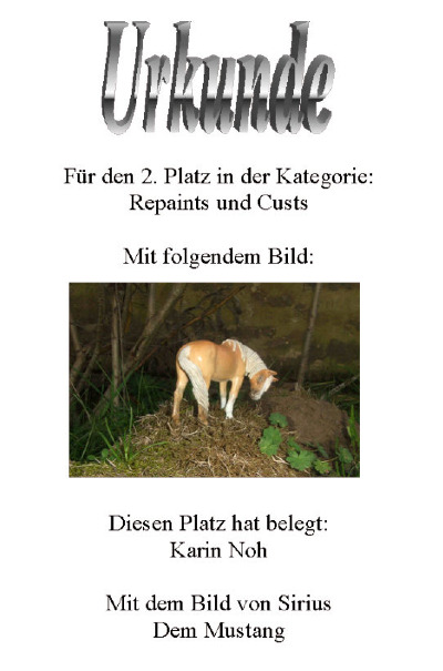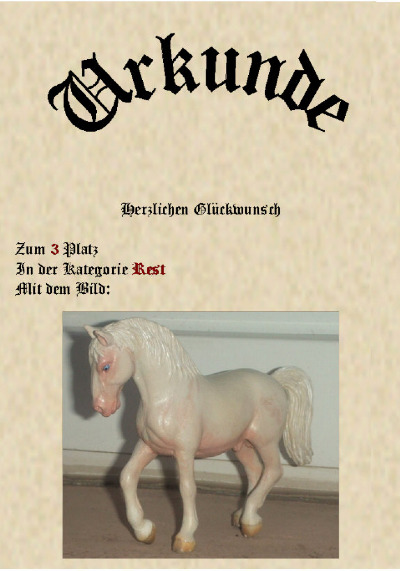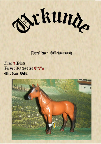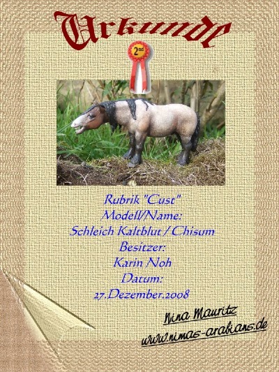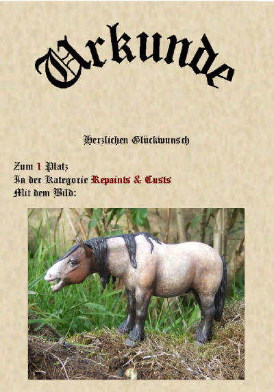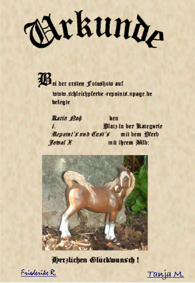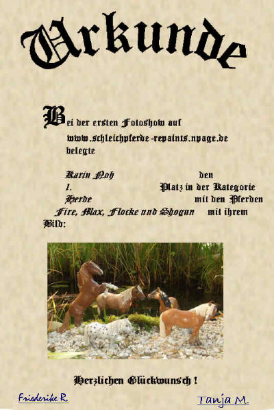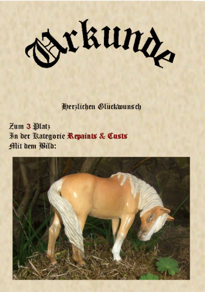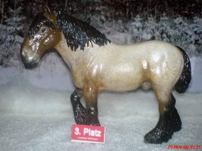 Sie hat mir angeboten einige meiner Modelle am 15.11.08 auf der LS in Mettmann zu starten, was mich sehr gefreut hat. Es wurden 4 meiner Schleich Cust gemeldet und von denen belegten 2 jeweils Platz 3.