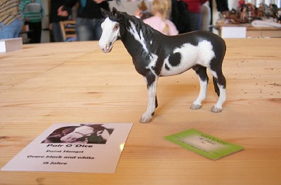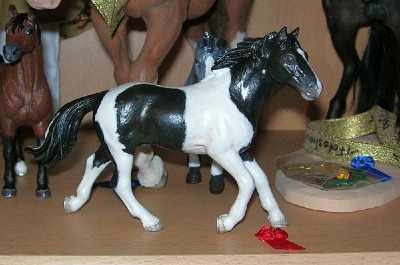 Mein erstes um bemaltes Pferd war der weiße steigende Hengst, mir hat die dunkle Mähne und der Schweif nicht gefallen, also habe ich sie weiß bemalt und Ihn bei ebay verkauft, dann kam der alte Pinto, er hatte einige Macken, die ich mit viel Fantasie beseitigt habe, dann wurde er schwarz bemalt mit Blesse und weißen Fesseln, zum Schluss einen glänzenden Firnis.