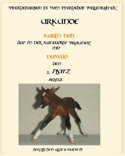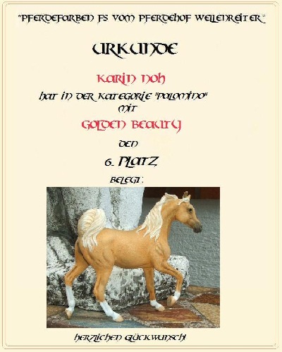 Die kleine O'lala hat auf der LS in Morsbach im Mai 2010 in der Kategorie Araber Cust's, in einer großen Klasse von Arabercusts(Breyer,Stone) teil genommen und Platz 5 belegt.