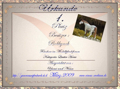Bei der Live Show in Morsbach 2009, hat BR.Tabitha Queenie hat in der Klasse Gangpferde Mini cust den 3. Platz belegt, sie wurden von ihren Besitzern Gabriele Harke von der Broken River Ranch dort vorgestellt