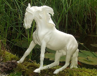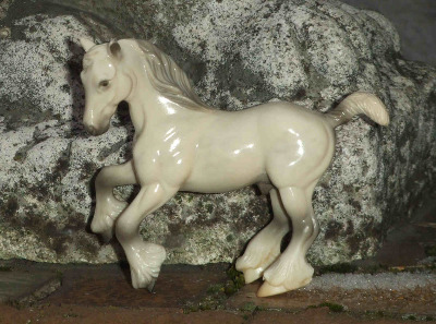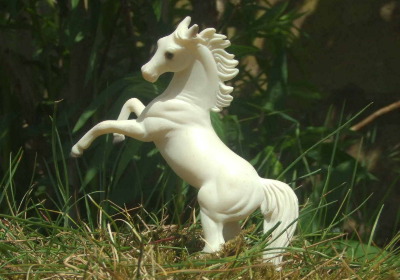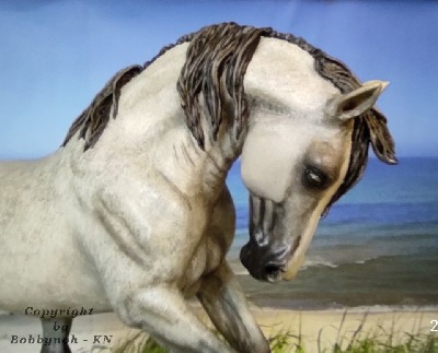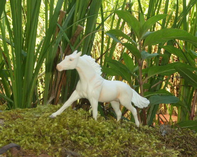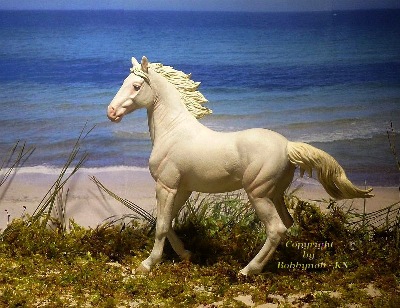 das Ausgangsmodell von Ghost ist die CollectA Achal Tekkiner Stute, bei ihr habe ich die Mähne neu modelliert und sie dann zu einem Cremello bemalt